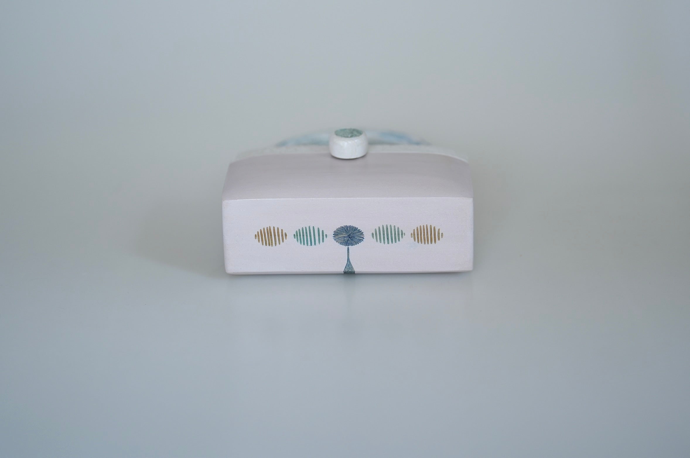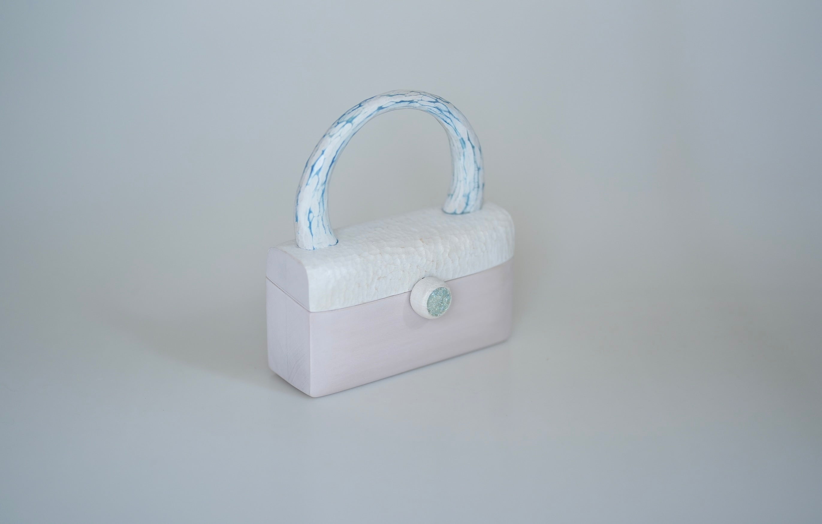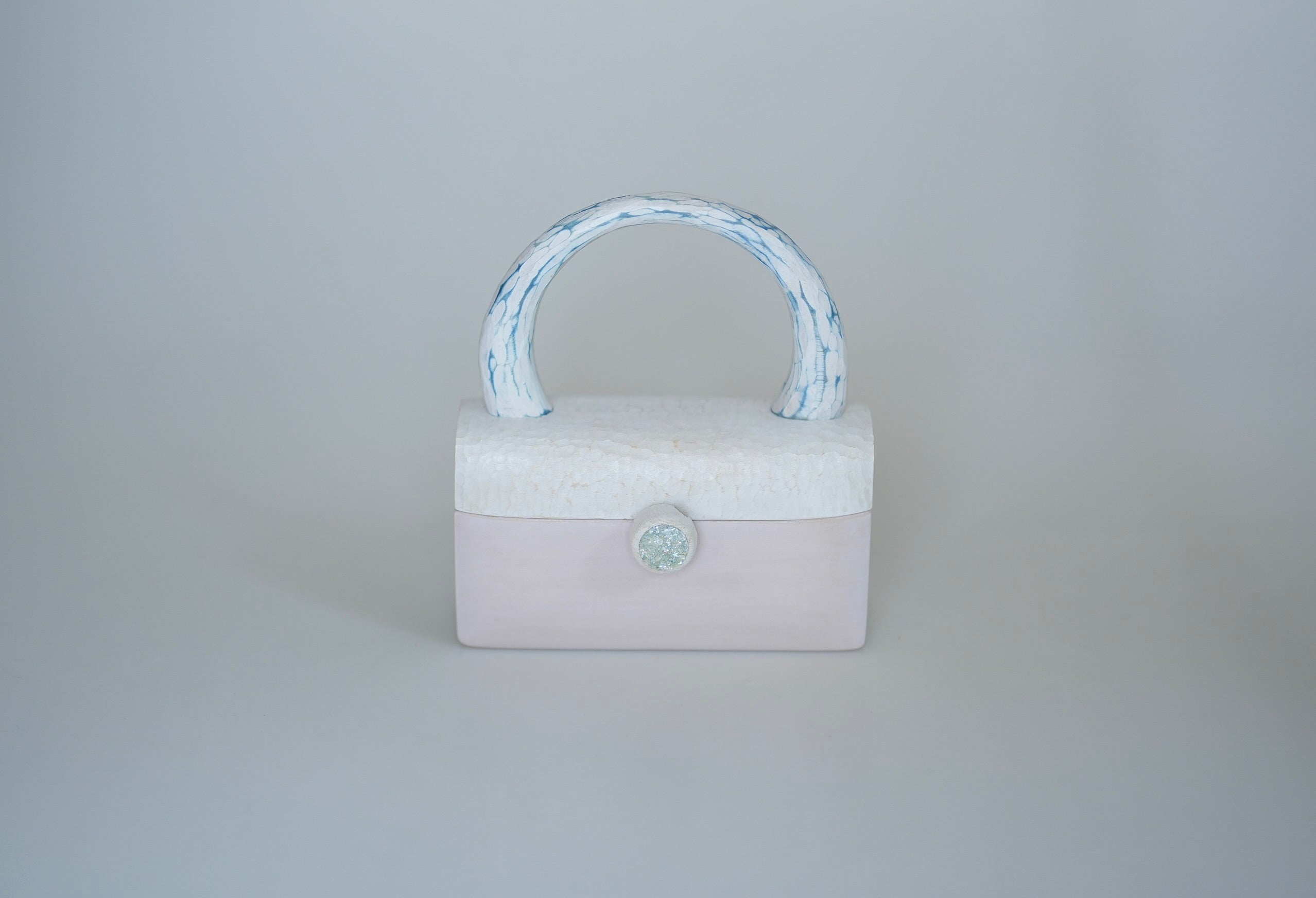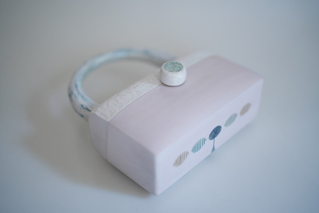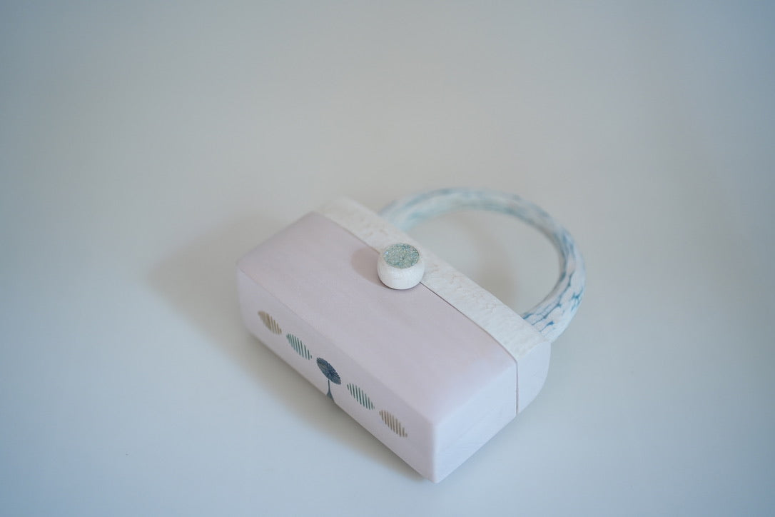 本体サイズ(外寸):W200×H108×D84 ハンドル 105 mm重さ: 452g本体:シナノキ 白two-tone染め+コーティング 上蓋彫り背面彫刻研ぎ出し ハンドル:シナノキ 白研ぎ出し複色染め+コーティング 留め:セン 白蝶貝 染め+コーティング