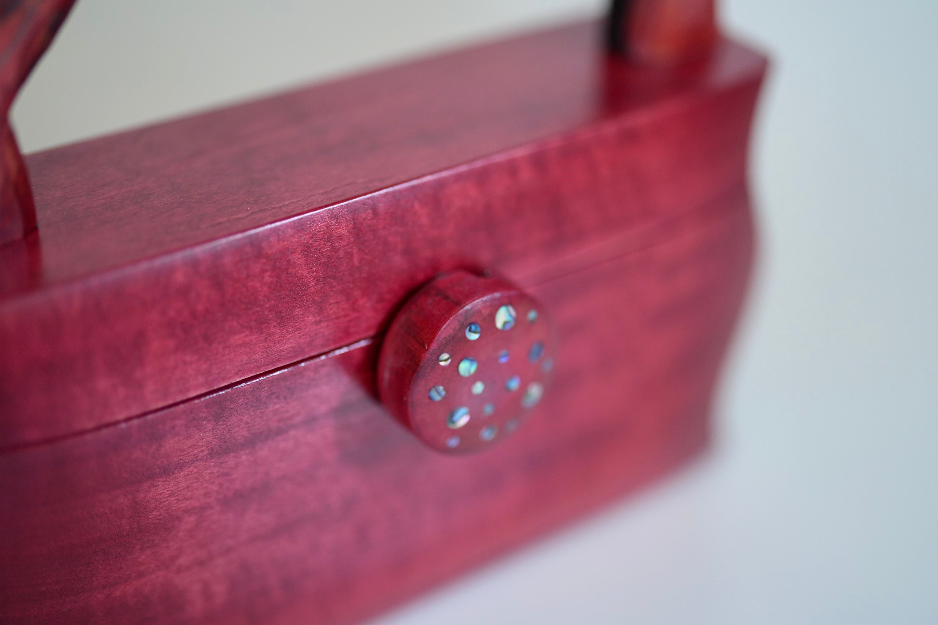 留め具には螺鈿。貝を埋め込んだ後、一旦表面を研磨してその後さらに質感を合わせるよう塗りを施し仕上げています。鈍い光のようでよく見ると美しい色が隠れています。